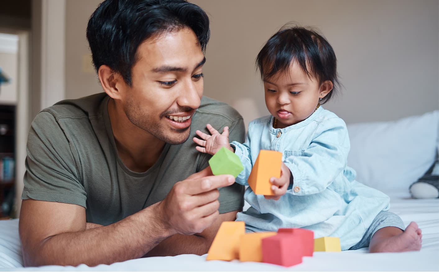 Children love this game! Crawl behind your child and say, "I'm going to get you!" Gently grab and lift your child in the air and say, "I have you!" Enjoy spending special times with your child laughing and having fun together. You are building a special relationship with your child when you do this.
